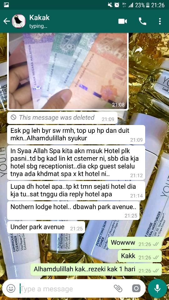 Dan kalau anda nak tahu.. saya dah pun 3 tahun berada dalam bidang ini.. ye, saya salah seorang beautician spa The Walking Beauty Saya sendiri dah dapat hasil memberansangkan, sebab tu saya galakkan sangat sangat anda pun buat benda ni.